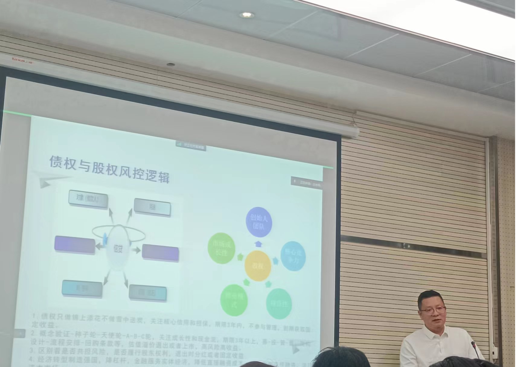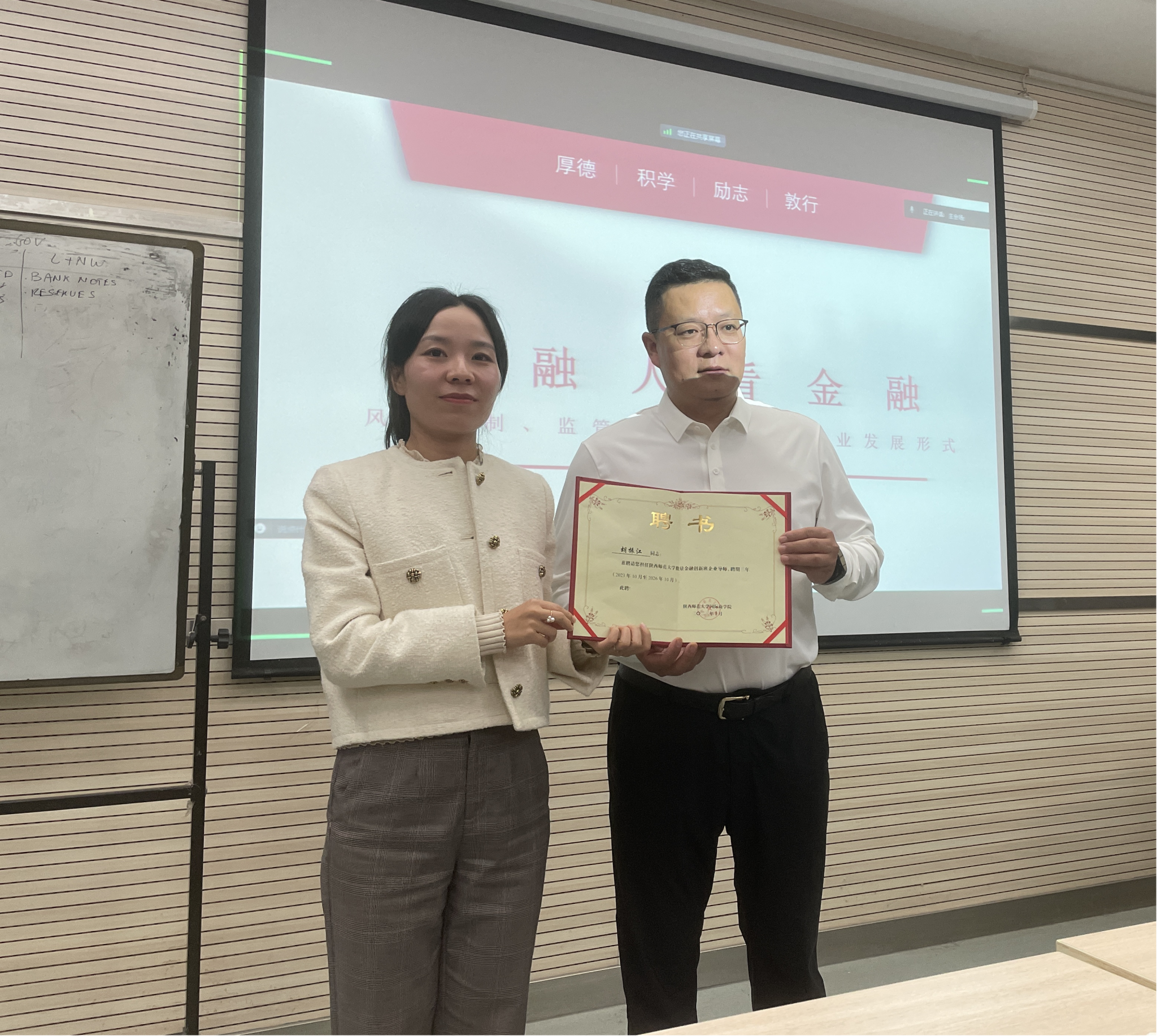 讲座伊始,数量金融专业系主任贾妮莎为胡振江颁发聘书,特聘胡振江担任数量金融创新班企业导师。胡振江老师从风险控制入手,分析了债权和股权的异质性风险控制逻辑,即是否共担风险,是否履行股东权利,退出时分红或者固定收益,借此强调金融要服务实体经济,注重风险控制。接着,胡老师指出科技创新使得对金融服务要求的提高,金融创新增多,但随着电子货币的发展,传统银行网点在不断减少,金融诈骗更加猖獗,金融监管存在全方位挑战。随后,胡老师介绍了中央金融监管体制和地方金融监管体制的沿革历史,以及当前的金融监管走向。最后,胡老师指出金融的本质是为有钱人理财,为缺钱人融资,信用、杠杆、风险的总和以及为实体经济服务。