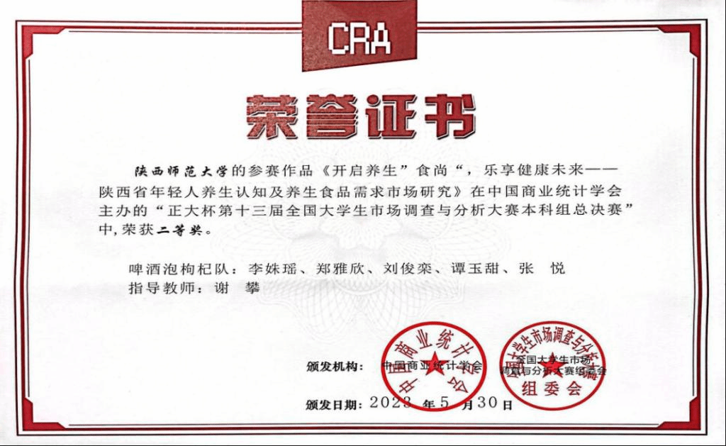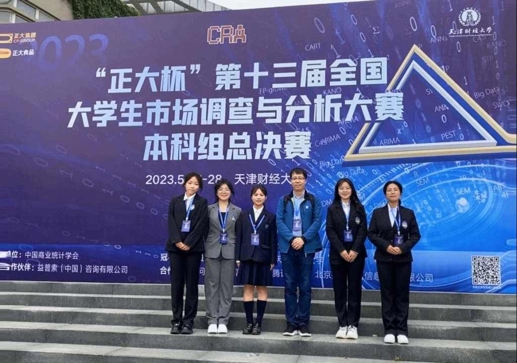 为增强经管学科学生的调查技能和统计分析素养,提升将理论知识灵活应用于实践的能力,陕师大学子积极报名参加第十三届全国大学生市场调查与分析大赛。完美体育官方网站2021级经济学专业郑雅欣、刘俊栾,2020级财务管理专业张悦、人力资源管理专业谭玉甜,与数学与统计学院2021级数学与应用数学(师范)专业李姝瑶组成的“啤酒泡枸杞队”,在指导老师谢攀副教授的悉心指导和完美体育官方网站、数学与统计学院的大力支持下,经过理论知识赛、校赛、省赛的层层选拔,晋级总决赛。2023年5月26日-28日,团队赴天津财经大学参加比赛,经过报告陈述和回答提问,最终荣获本科生组总决赛二等奖,创我校参与该项赛事以来的最佳成绩。