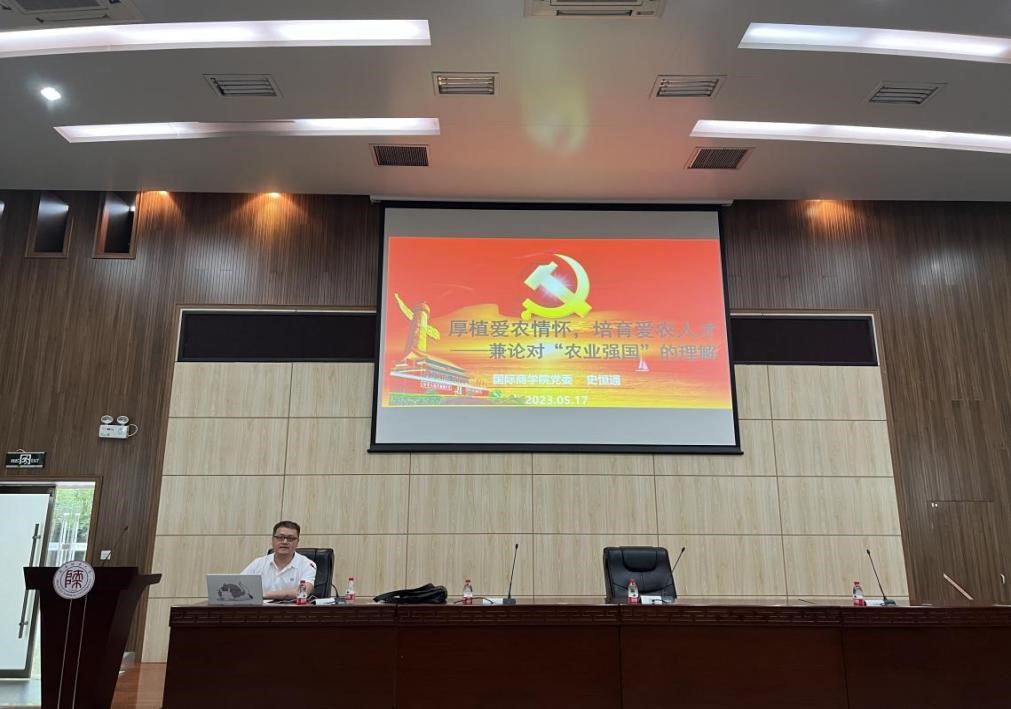 为深入学习贯彻习近平新时代中国特色社会主义思想主题教育,贯彻落实党的二十大精神,5月17日下午,副院长、党委委员史恒通在文澜楼B段报告厅组织开展了“厚植爱农情怀,培育爱农人才——兼论对‘农业强国’的理解”主题党课学习,组织管理系党支部、工商管理研究生第一党支部、会计专硕第一党支部、理论经济学研究生第三党支部、应用经济学研究生第三党支部全体党员参加了党课学习。