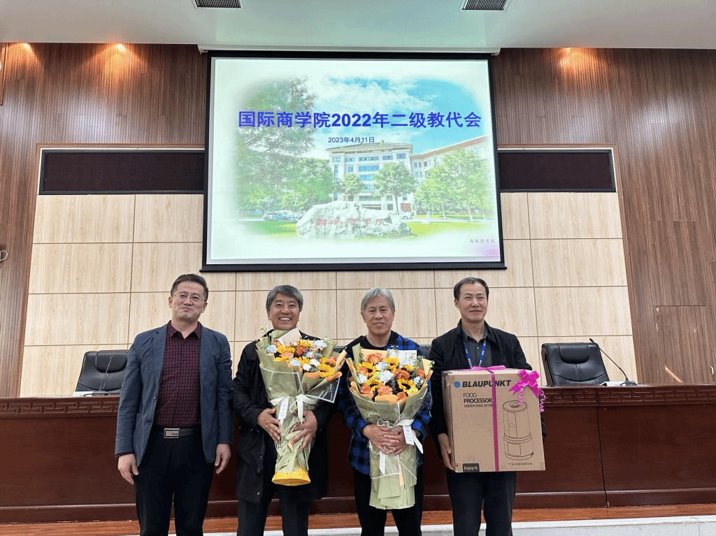 会议第二阶段,学院全体教职工欢送了2022年退休教师,许军老师和刘湖老师分别发表了自己的退休感言。雷宏振院长和思培峰书记代表全院教职工为两位老师送上纪念品,经济系和工商管理系两位年轻教师代表送上鲜花,师道传承,不负芳华。