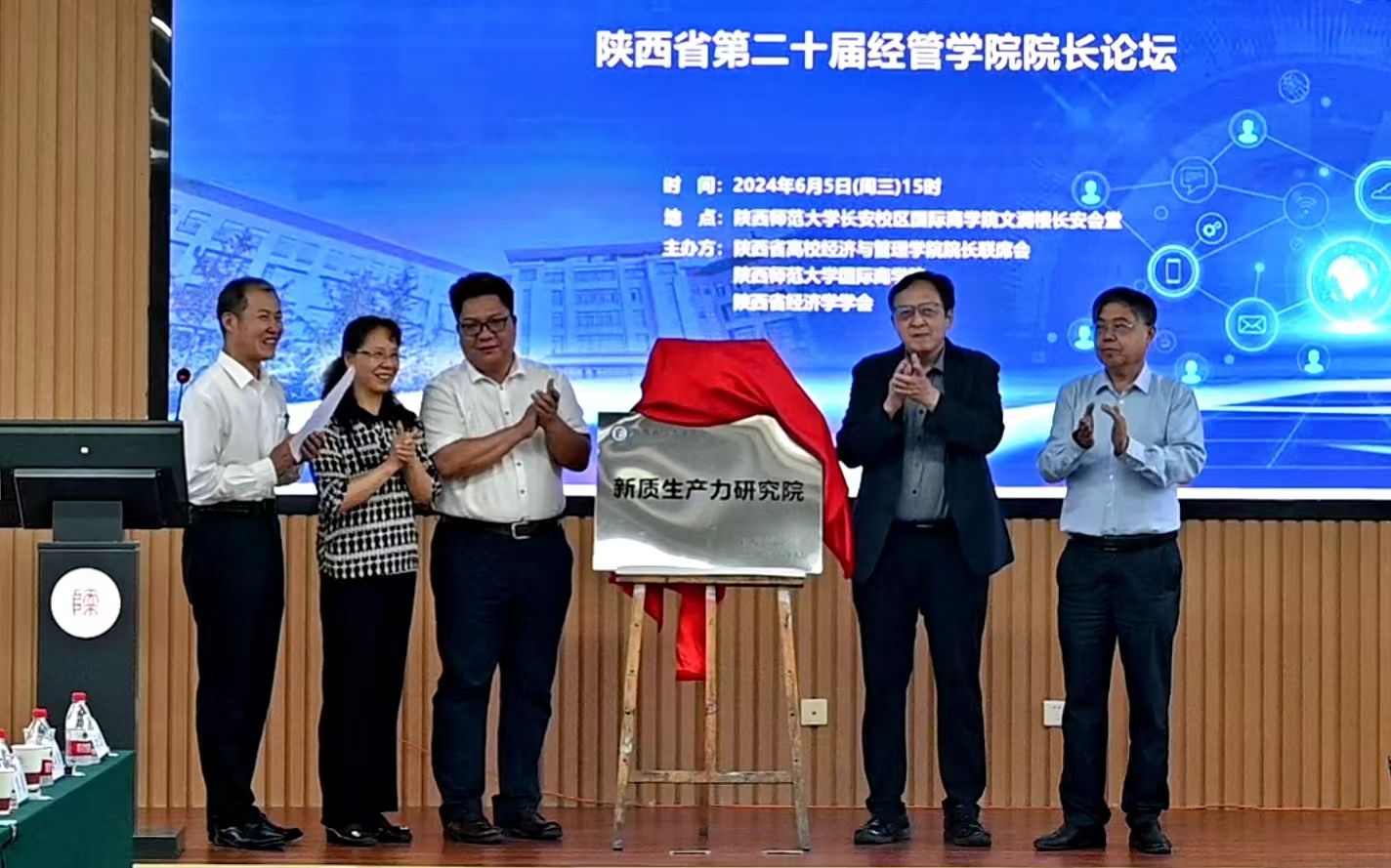 我校副校长杨祖培代表学校向参加论坛的嘉宾与院长表示了热烈地欢迎和衷心地感谢。她简要介绍了学校和学院的发展情况,希望通过此次论坛的深入研讨和交流,为推进智能化应用人才培养建设创新提供有益的借鉴和指导。开幕式上,中国科学院大学教授、《科研管理》主编穆荣平,陕西省社科联社会组织管理部部长张金高,陕西省经济学会会长、西安邮电大学数字经济研究院院长张鸿,我校副校长杨祖培为陕西省经济学学会“新质生产力研究院”揭牌。