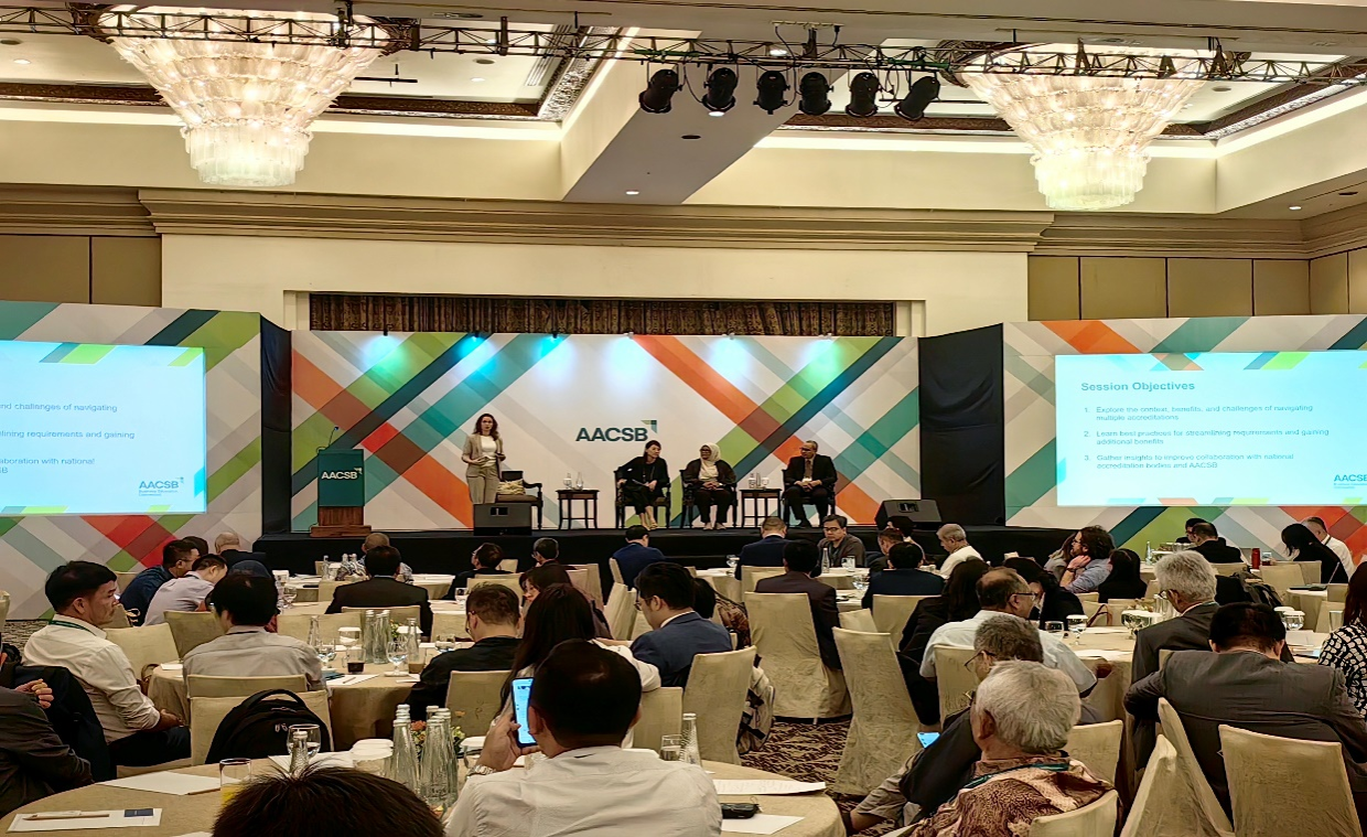 6月7日,会议进行了三场主旨讲座、一场中国院校专场交流会和一场亚太地区院校交流会。第三日的主旨讲座主要围绕着“商学院社会影响力的衡量指标”,“认证标准实施中的常见误解和迷因”和“使命驱动下的商学院认证之路”这三个主题展开。亚太地区院校交流会则在轻松又热烈的氛围中围绕着AI技术对商科教育的影响展开了积极的讨论。