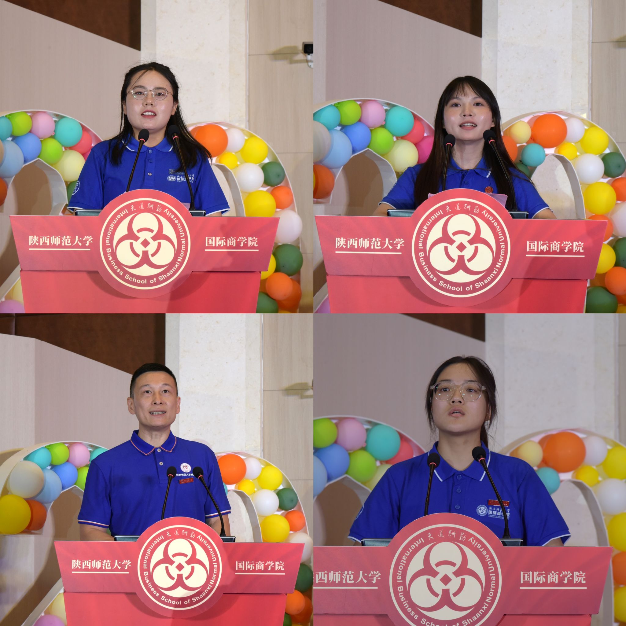 全日制研究生代表、国民经济学博士生罗瑞,非全日制研究生代表、MBA方向黄山,本科生代表、人力资源管理专业谭玉甜相继发言。他们对学校的悉心栽培表达了诚挚感谢,对学弟学妹们送上了殷切祝福,他们立志在未来的道路中保持坚韧与创新,勇毅前行,不忘初心,不懈奋斗,时刻展现商院学子的风采风貌,不负学院嘱托。在校生代表、2021级经济学专业本科生赵秋阳在发言中向学长学姐顺利完成学业表示祝贺,同时承诺会在未来的学习生活中秉持创新精神,勇敢追求梦想。