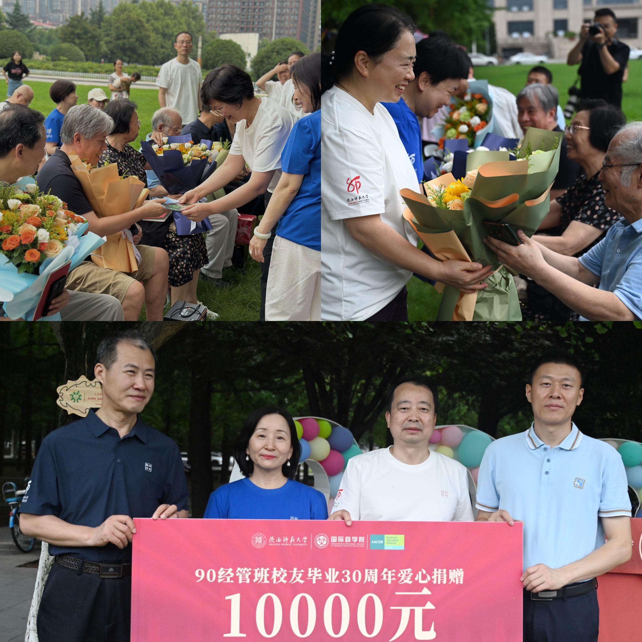 为表达对恩师的感激之情,校友们向老师们献上了鲜花和纪念品。雷宏振和邱远航代表学院接受了毕业生们的爱心捐赠。