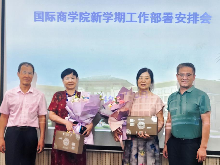 会议第一阶段是欢送退休老师,由党委副书记,纪委书记邱远航主持。退休老师邢丘丹,胡秋灵分别作荣休发言,教师代表为退休老师献上鲜花,雷宏振院长、思培峰书记为退休老师赠送纪念品,表达了对退休老师的祝福。