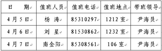 注意:值班人员务必坚守岗位,负责处理学院的日常事务。遇有重大事件时应立即按程序规定,向学院值班领导和学校总值班室值班人员报告,按指示处理有关事宜。