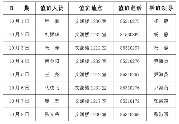 注意:值班人员务必坚守岗位,负责处理学院的日常事务。遇有重大事件时应立即按程序规定,向学院值班领导和学校总值班室值班人员报告,按指示处理有关事宜。
