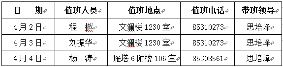注意:值班人员务必坚守岗位,负责处理学院的日常事务。遇有重大事件时应立即按程序规定,向学院值班领导和学校总值班室值班人员报告,按指示处理有关事宜。